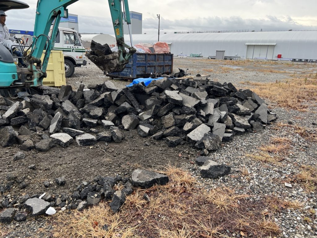 新たに新設する工場棟へ電気を引き込む工事のため既存のアスファルトをめくった様です。